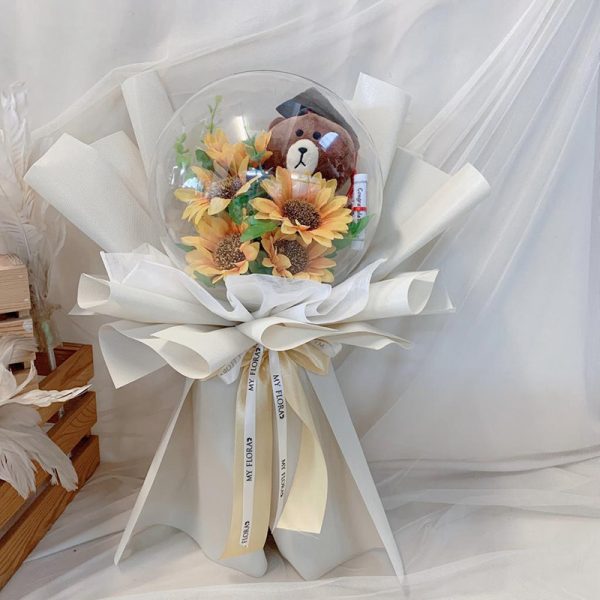 – Silk/ artificial sunflowers and 5-6″ graduation bear inside acrylic ball.